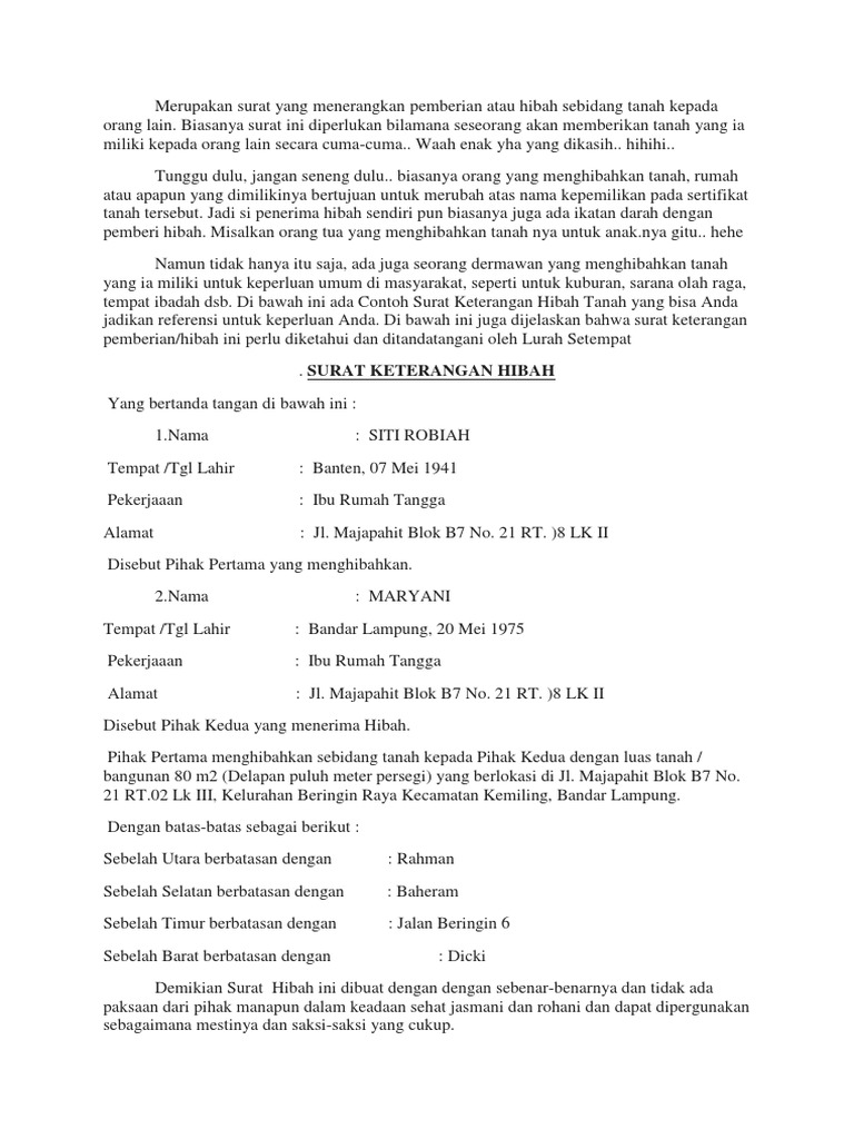 Contoh Surat Hibah Tanah Dari Orang Tua Kepada Anak / (1) yang tidak termasuk subjek pajak sebagaimana dimaksud dalam pasal 2 adalah:. (1) yang tidak termasuk subjek pajak sebagaimana dimaksud dalam pasal 2 adalah: Menurut kompilasi hukum islam yaitu hibah tidak dapat ditarik kembali, kecuali hibah yang diberikan oleh orang tua kepada anaknya.
